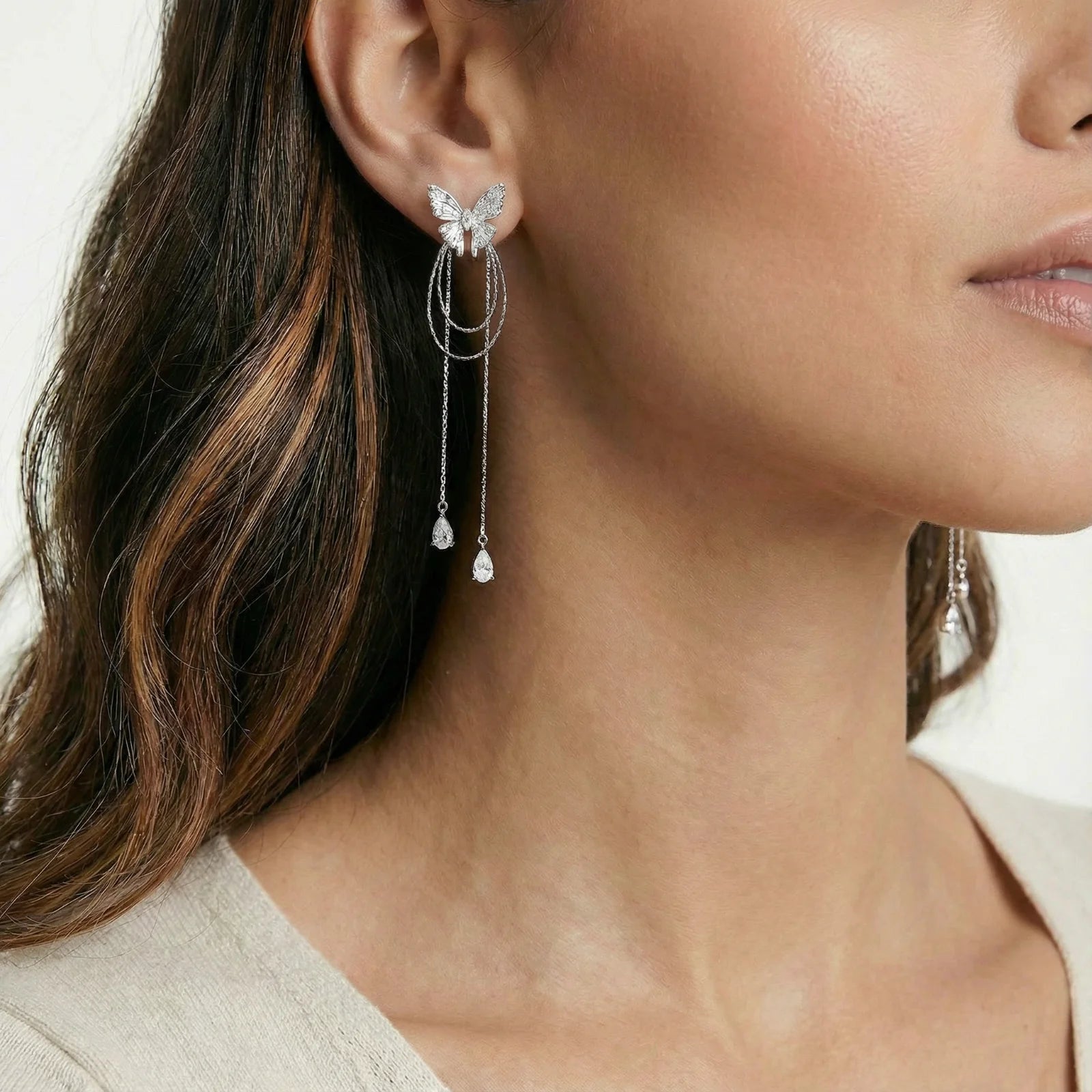 Delicate zirconia butterflies perch atop cascading silver threads that sway with your every move.